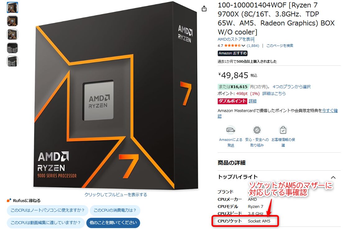 Ryzen 7 9700Xの場合は、AM5のソケットに対応している事が記載されてるね。