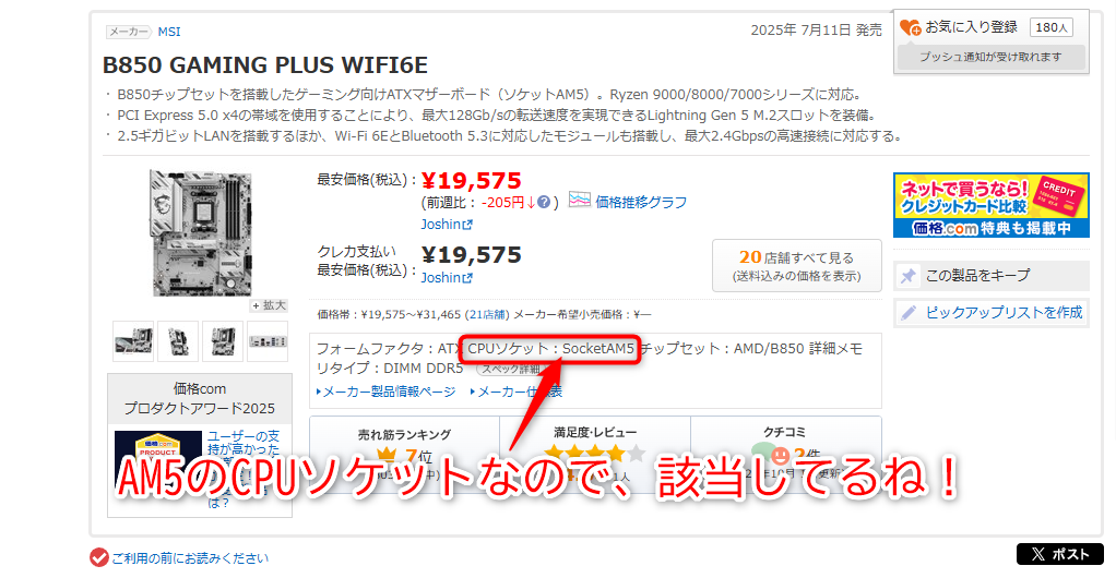AM5のCPUソケットで対応してる!値段も2万円弱だし、評価も結構良い感じだし。コレにしよう!