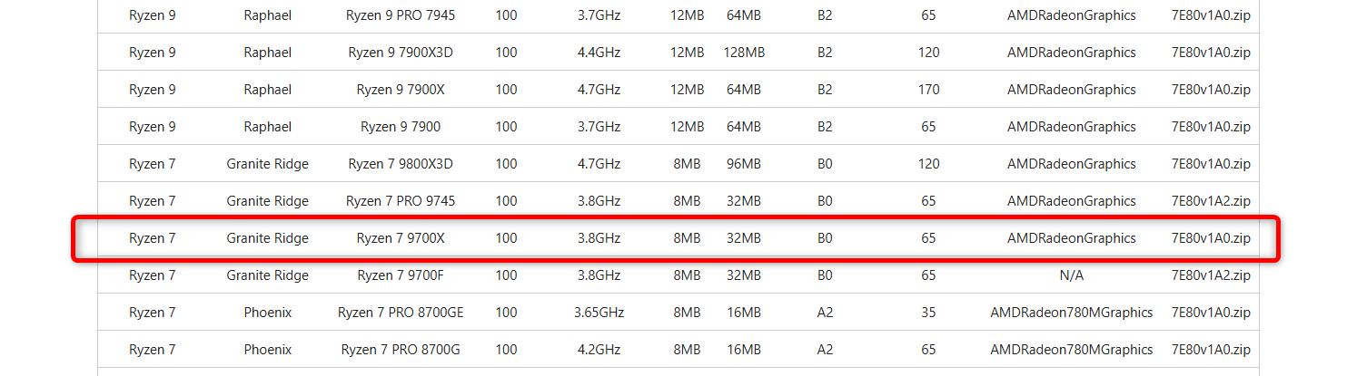 で、あと一応念のため確認して欲しいのが、選んだマザーボードの公式サイトにあるCPUサポート表。