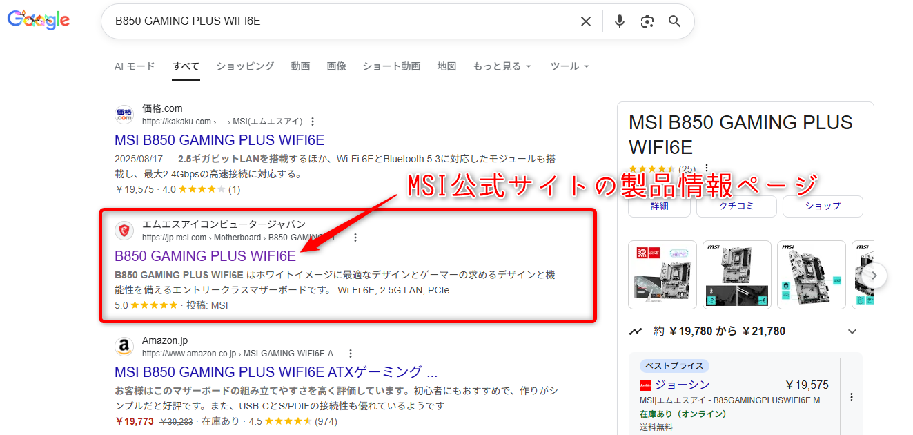 今回であれば、B850 GAMING PLUS WIFI6Eというマザーを選んだから、B850 GAMING PLUS WIFI6E とそのまま型番で検索してあげると、